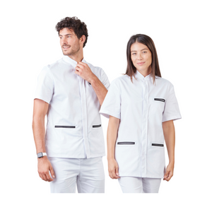 Túnica médica mixta entallada con cuello. Un modelo eficiente con detalles elegantes.