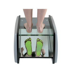 Il se compose d'une structure en bois laqué avec une partie supérieure transparente sous laquelle se trouve un miroir incliné reproduisant fidèlement la plante des pieds et mettant en évidence les différentes pressions des appuis.
