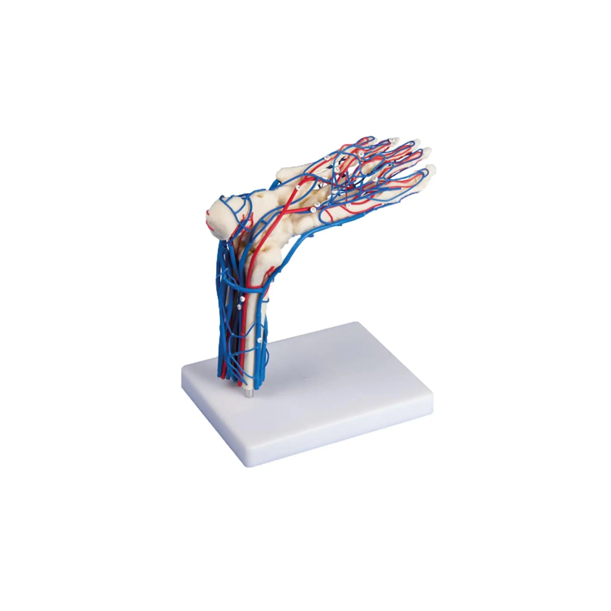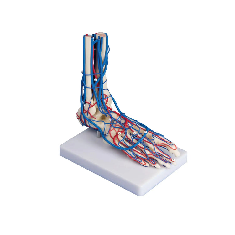Life-size model of a right foot showing all major veins and arteries. The vascular system is represented on both the top and bottom of the foot. The base can be removed and placed upside down on the tripod to view the underside. On tripod.